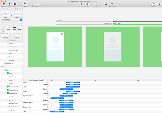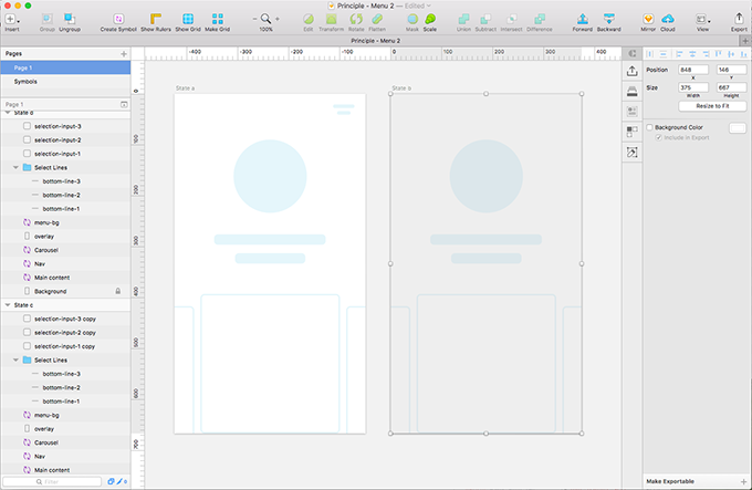 Principle works best if you plan layouts with ‘screens’ or ‘states’ that will transition into each other. Because you are going to be orchestrating a series of events, it is very helpful to have a general script. Try to think through and plan out the steps that you would like to animate:
