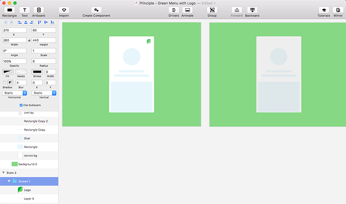 You don’t create masks in Principle like you would in Illustrator or Sketch, which you would do by linking two layers. Instead, masks are create by groupings in folders. If you put elements in a folder, you simple click ‘Clip Sublayers’ and the layers in the folder will not appear outside of it’s bounds. Because of this, you want to organize your sketch layers according to how you want to clip them.